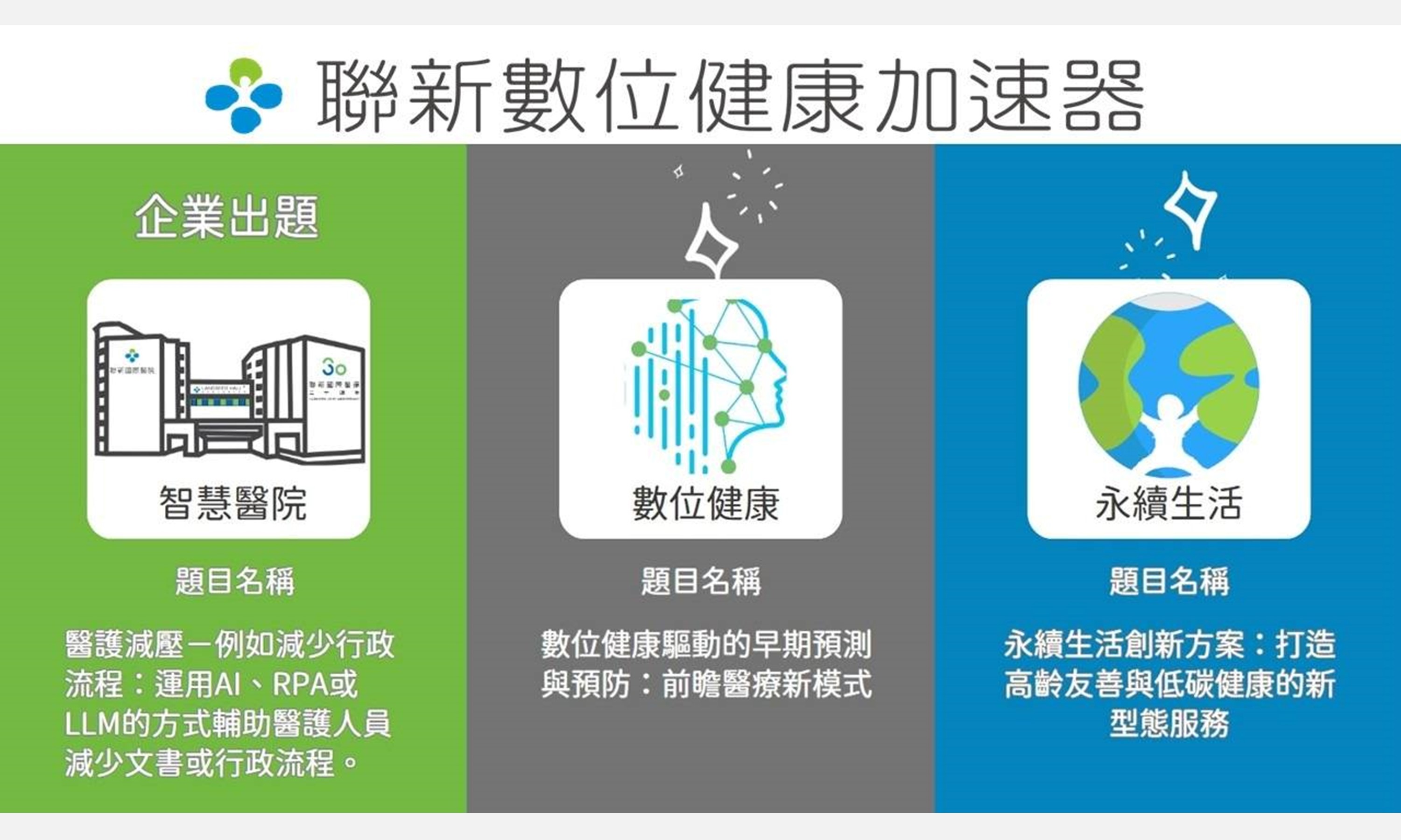 联新数字健康加速器邀请精诚信息、舞云智网等产业伙伴,以实际的医疗与数据痛点作为出题方向,期待透过创意与技术的碰撞,催生下一波可落地的智慧健康解决方案。精诚信息则以「数字健康驱动的早期预测与预防」为方向,结合其云端与数据整合优势,探索健康数据应用于前瞻医疗的新模式;舞云智网则聚焦「永续生活创新方案」,以IoT与5G边缘运算技术为基础,推动高龄友善设计、绿色医疗与低碳健康管理,打造兼具智慧与永续的新型态服务场景;联新国际医院以「医护减压」为核心,寻求能运用AI、RPA或LLM技术,协助医护人员减少行政与文书负担的创新解方,三家出题企业共同构成一个跨域命题矩阵,让参赛者得以站在产业前线,提出具市场化潜力的创新提案。