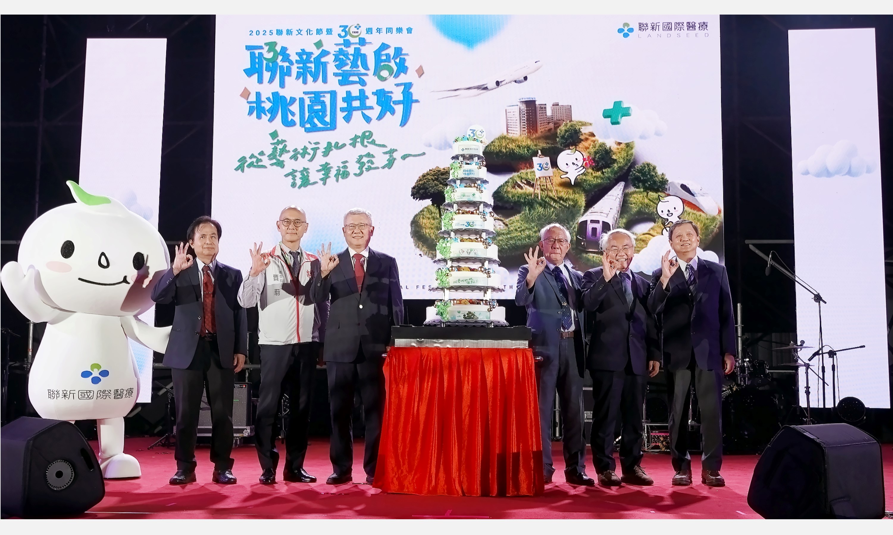 ▲2025联新文化节暨联新国际医院30周年同乐会,吴清平院长(右起)、黄忠智院长、许诗典院长、张焕祯创办人、桃园市卫生局局长贾蔚及廖文山院长与联新国际医疗同仁齐贺30周年生日快乐。