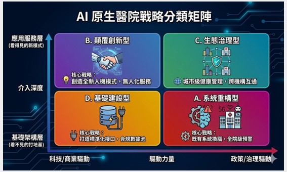 当我们扫描全球顶尖医院的转型路径时,会发现「AI 原生(AI-Native)」有各种各样的演化,作者尝试用两轴将全球 AI 原生医院划分为四种截然不同的演化类型,称为「AI原生医院战略分类矩阵」。第一轴是「驱动力量」,是由底层技术创新推动,还是由上层治理需求主导;第二轴是「介入深度」,即 AI 是用来改造看不见的基础架构,还是用来创造看得见的全新服务模式。