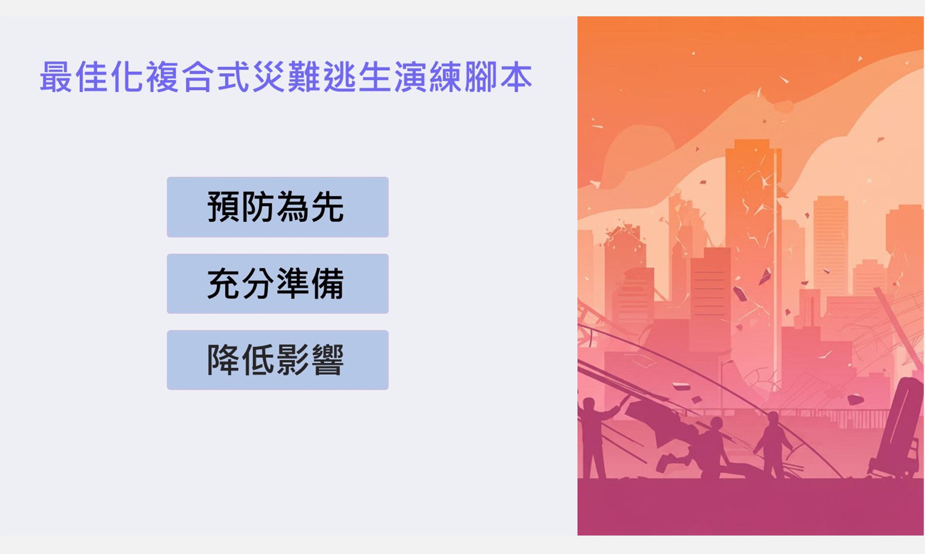 复合式灾难事件在不确定性和扩散性上具高度挑战,灾害可能引发多重危机。行政管理部「维安先锋队」的目标,是透过制定周全的逃生演练脚本来降低风险。正如项目目标所述:「预防为先,降低风险才能赢在起跑点。」这一逃生演练脚本,通过全面计划的制定和多部门协作,有效保障人员安全。