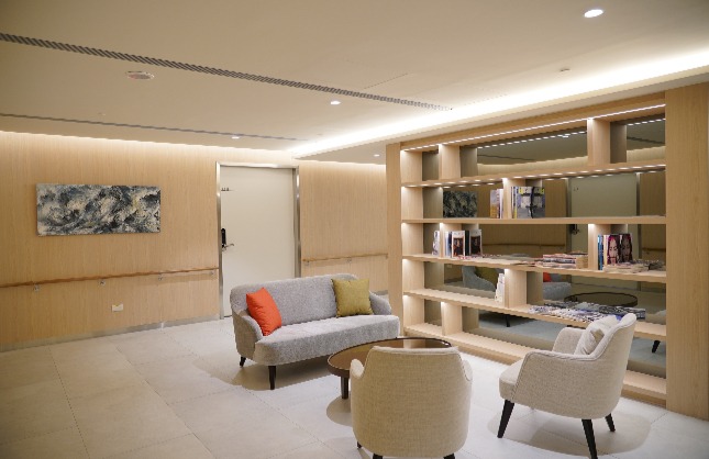 在尊爵国际病房公共空间规划上,病人们虽身处于医疗环境之中,我们预设空间情境如同在城市书店之中,因此,护理服务软硬件适度调整缩小为“卫星护理站”,将空间让给住院病人及家属作为休憩使用,可以随时在书架旁的沙发区安静阅读,也可以在咖啡区的大桌共同面对面讨论,整体从走道旁圆弧而流线型的木纹墙面,从材质色调到家具选配,从住院用品到艺术摆设等细节,都依循着明亮穿透的开放空间氛围;家具选择客制化自然原木设计,书架上呈列健康、艺术、设计、文学等主题书籍提供阅读,这些细节也是医院形象表现的一种形式,也是一种空间文化上的体验。