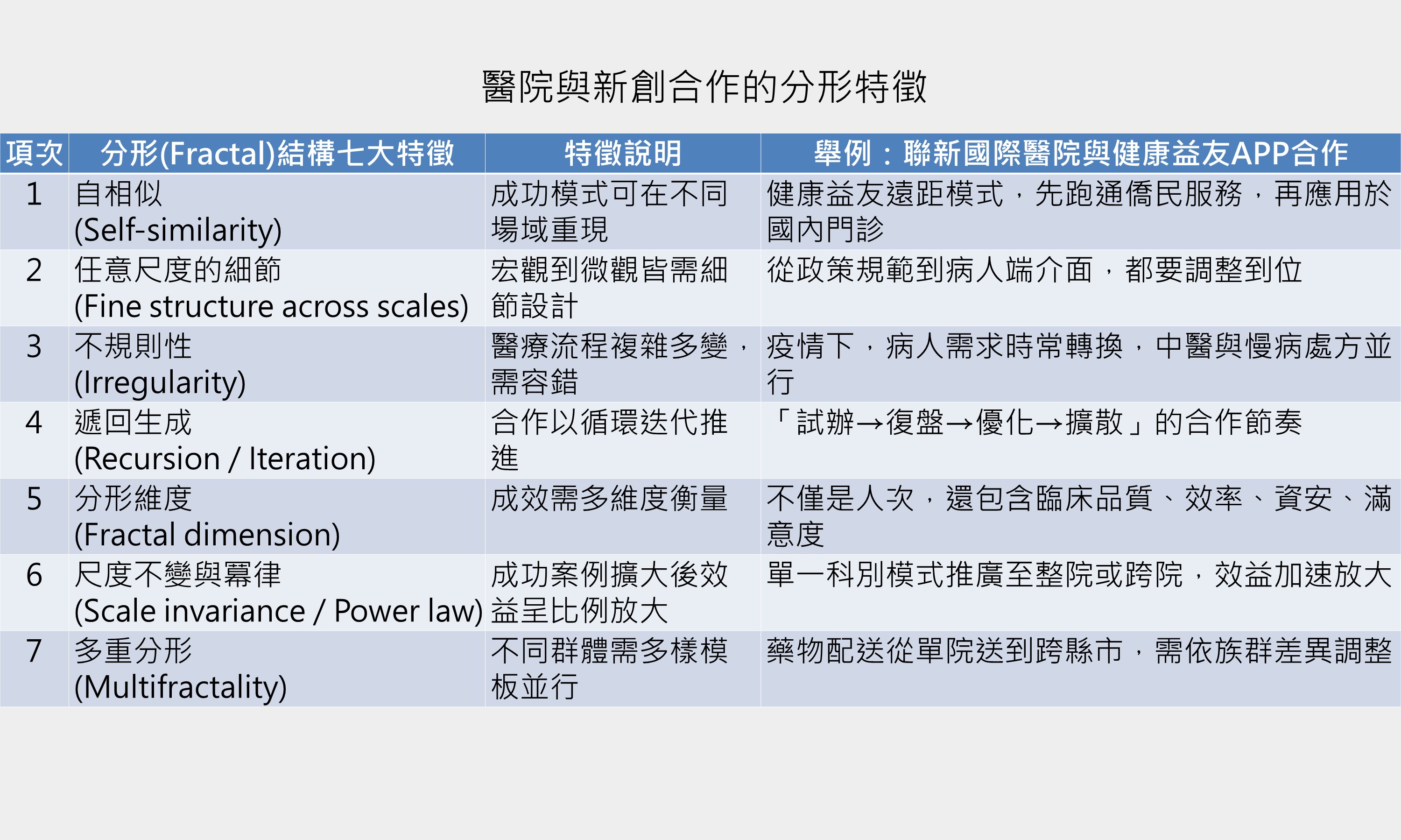 所谓的创新生态系,是指一群相互依赖的行动者,透过协调互补资源来实现价值主张。换言之,它不是单一组织的成果,而是多方协作下的网络结构。若从这个角度来看,医院与新创的合作,就不应被理解为一次性的产品导入,而是要能够在不同层次自我繁衍与扩散,这正呼应了分形(Fractal)的特征。